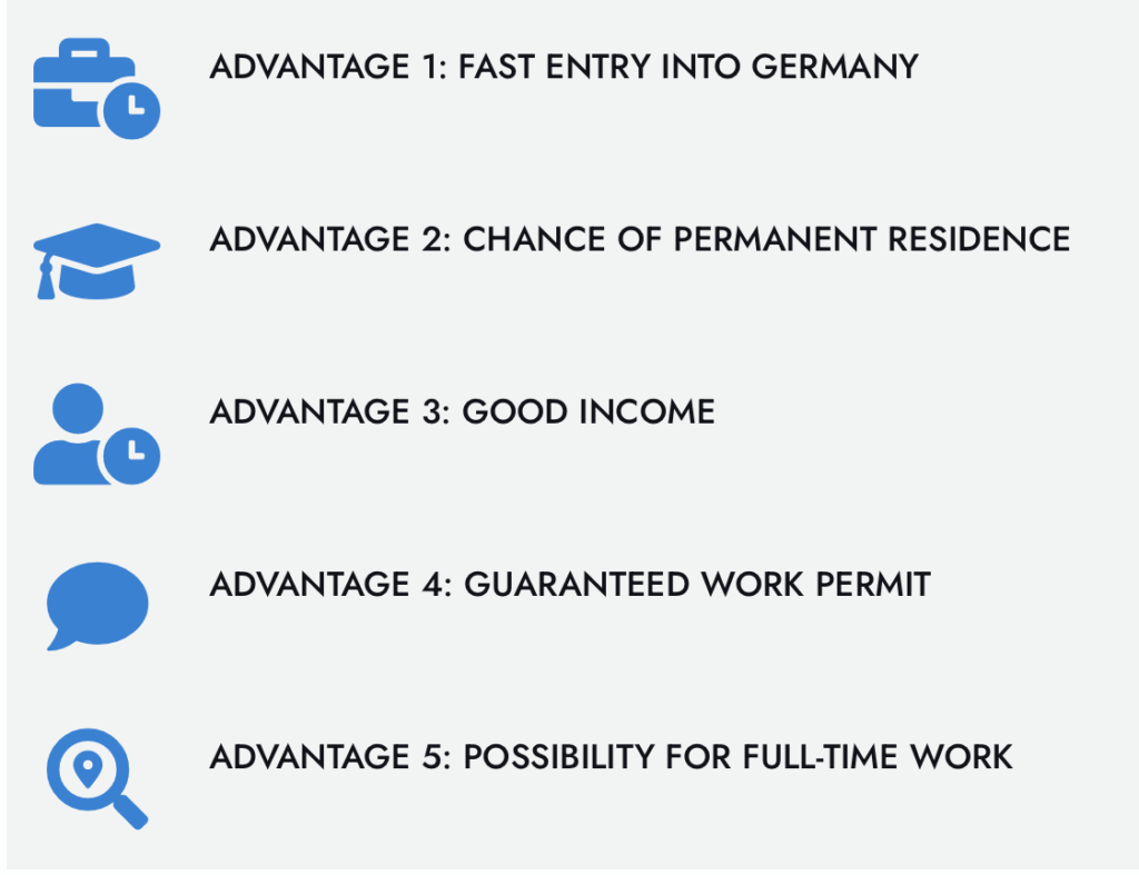 • Easy entry: No job offer needed in advance. Stay in Germany for 1 year to job-hunt, work part-time (up to 20h/week), or take trial jobs.